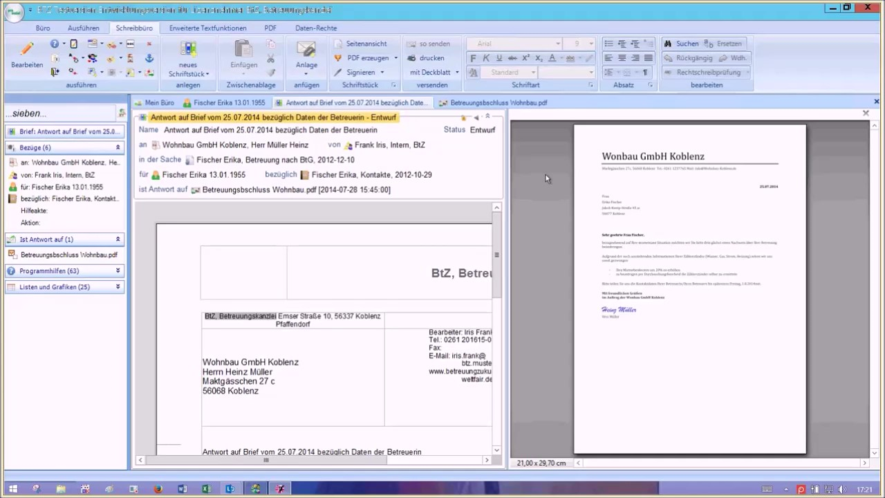 Die "Split-Screen"-Werkstatt im butler-Schreibbüro macht's möglich: Sie sehen links das, was Sie schreiben, und rechts daneben den Brief, den Sie bekommen haben (bzw. das Fax oder die